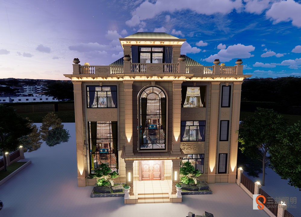 別墅燈光采用3D漫游設(shè)計(jì),燈具采用專業(yè)工程款瓦楞燈、洗墻燈、LED投光燈、定制柱頭燈、壁燈、草坪燈等,整體燈光營造浪漫、溫馨的環(huán)境。
